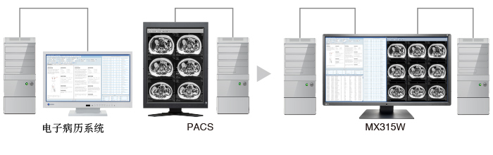 MX315W 采用了PbyP(画边画)技术,该功能可以在一个屏幕上的两个并排窗口中显示两路不同信号。用户可以使用该功能查看并排显示的不同系统,例如图像检查系统和放射信息系统(RIS),或者电子病历系统和图片存档及通讯系统(PACS)。这样用户在同时查看多张图像时不会被边框转移视线。