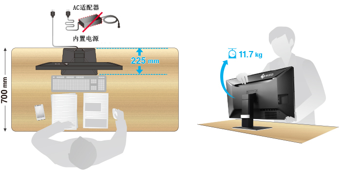 MX315W 的超薄设计和内置电源缓解了安装区域的杂乱,营造舒适的工作环境。该显示器采用轻量型设计,包括内置电源在内仅重11.7 kg。其不但便于携带,而且也能轻而易举安装。