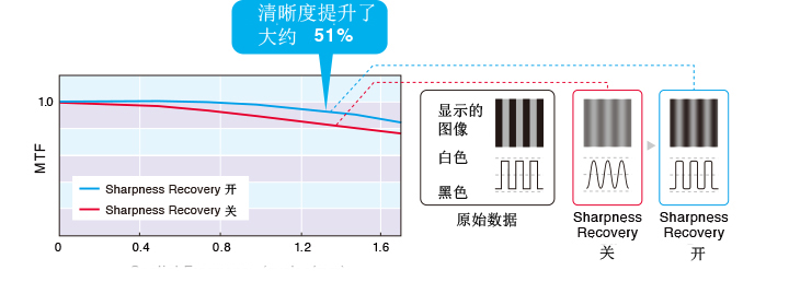 MTF以数值的方式衡量面板如何忠实地显示原始图像数据细节以供查看。当Sharpness Recovery功能开启时,在2个像素线对(空间频率为1.467cycles/mm)情况下,MTF将增加大约51%。