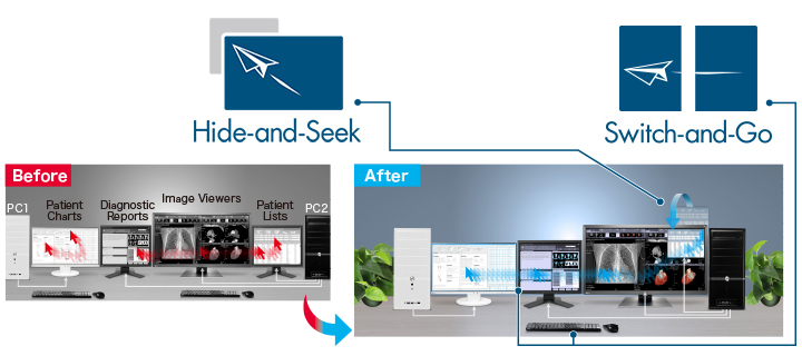 用户可利用“Hide-and-Seek”功能可轻松隐藏当前不用的PinP(画中画)窗口,在需要时将鼠标光标移到屏幕边缘就可以重新打开该窗口。这样无需额外的显示器就可以快速高效地查阅报告、患者病历及其他信息。
