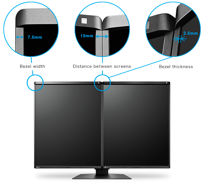 With a 7.5 mm bezel, the world's narrowest bezel on a 5 megapixel monitor, the total distance between two side-by-side screens is only 15 mm. Furthermore the screen is almost completely flat with the bezel sitting only 2.5 mm above the screen.
